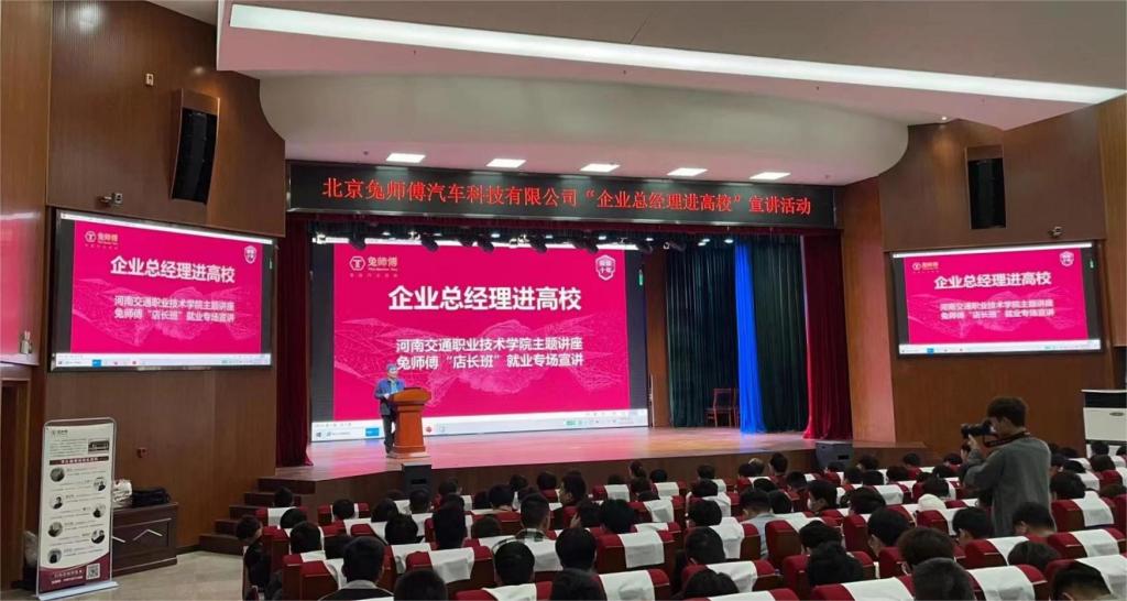 下午14:00,兔师傅在航海路校区艺术中心报告厅进行了“企业总经理进高校”宣讲活动,300余名学生参加了宣讲。活动中,王真为大家带来“中国汽车后市场分析”讲座;兔师傅人力资源总监李少博详细介绍了兔师傅店长班规划;郑州兔师傅中牟学苑路店/郑州白沙店创业店长,汽车学院优秀毕业生王燕飞,分享了他的个人职业成长经历,为同学们未来的实习、求职提供了新思路。