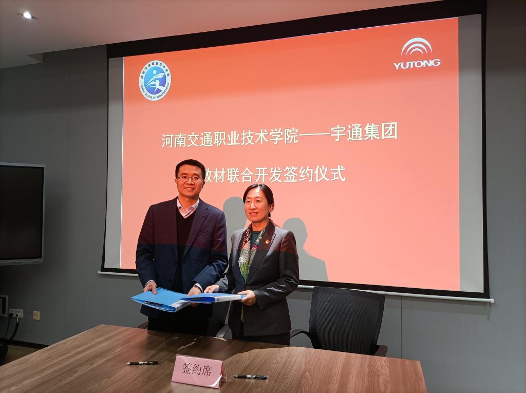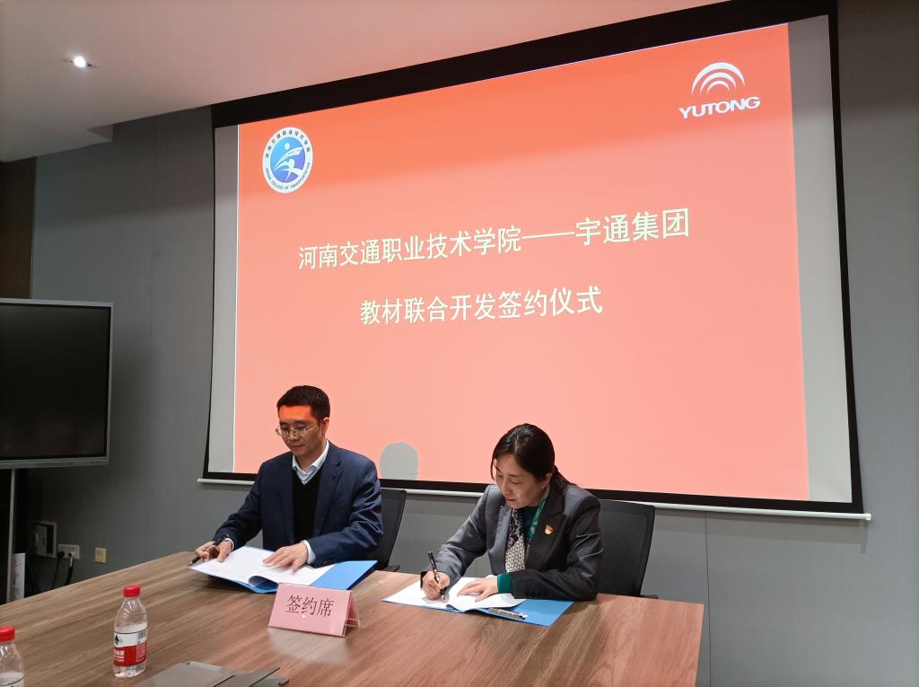 为加强学校现代产业学院内涵建设,切实提高教材建设水平,5月9日,宇通产业学院举行了教材联合开发签约仪式,我校汽车学院副院长袁荷伟与宇通集团教育公司研发部门负责人魏玲作为双方代表进行签约。