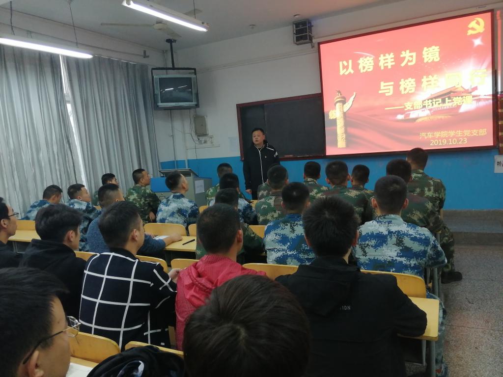 根据学院“不忘初心、牢记使命”主题教育工作安排和学生党支部“不忘初心,牢记使命”系列统一部署,10月23日,汽车学院学生党支部书记胡训华以“以榜样为镜 与榜样同行”为主题,为学生支部全体学生党员上了一堂严肃又生动的党课。
