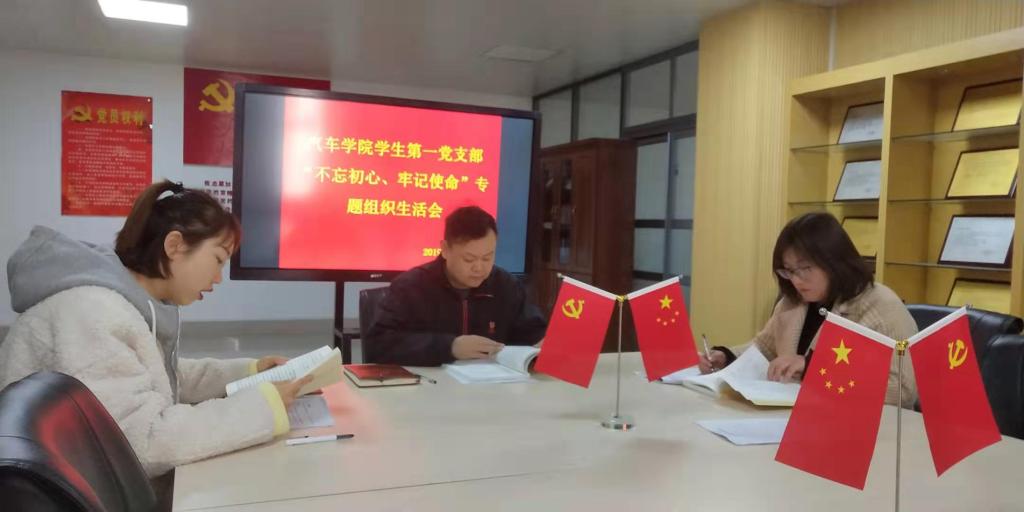 首先,由党支部书记胡训华传达了会议精神,并简要介绍了会议流程。接着,胡训华同志组织支部成员学习《习近平关于“不忘初心、牢记使命”论述摘编》并代表汽车学院学生第一党支部委员会向全体党员做了述职报告,详细讲述了支部这一年的基本情况变化,包括党员、入党积极分子人数的变化;梳理并引导大家回顾了党支部这一年组织的各类主题党日学习活动;并对2019度本支部所存在的问题整改情况作了汇报。