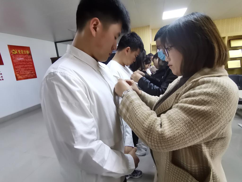 经与会党员进行充分讨论后,参会的全体正式党员进行了投票表决,全票通过了33名预备党员的转正申请。随后,学生党支部的参会党员为转正的学生党员佩戴党徽,全体参会党员进行入党宣誓。