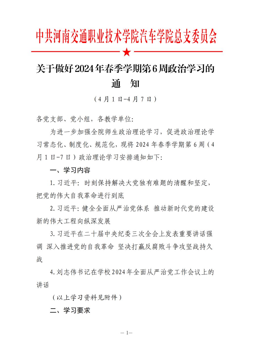 2024年春季学期第6周政治学习安排