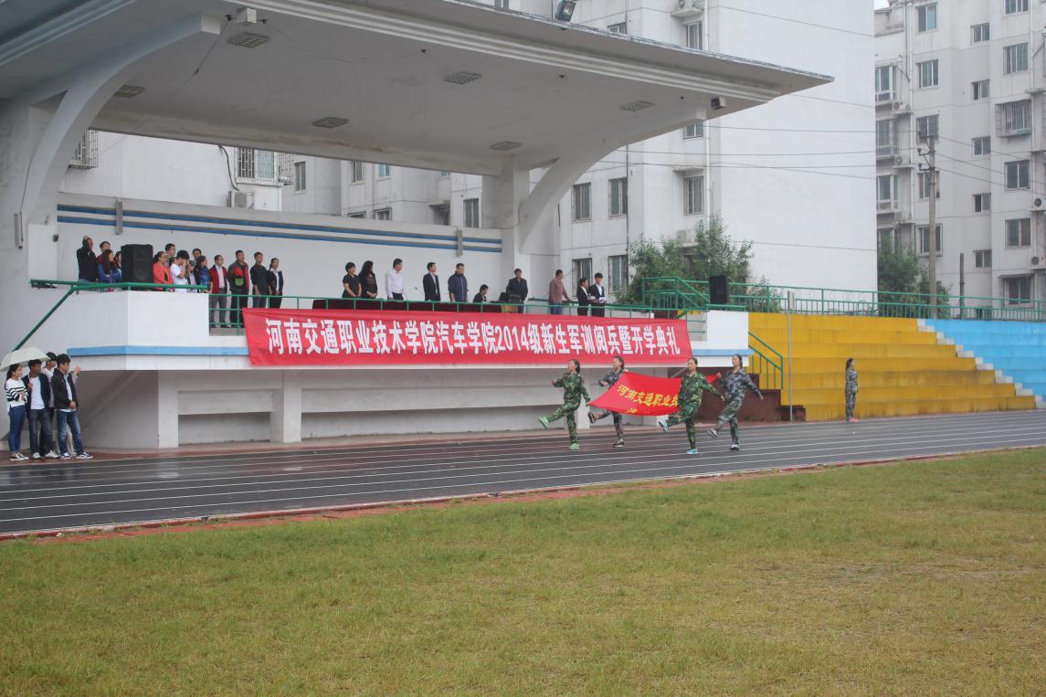 9月12日上午9:30,河南交通职业技术学院汽车学院2014级新生军训阅兵暨开学典礼在航海路校区隆重举行。汽车学院相关领导参加了典礼。经过10天的训练,新生们以饱满的精神、昂扬的斗志在绵绵秋雨中接受了领导的检阅。