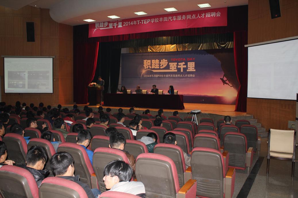 2014年T-TEP学校丰田汽车服务网点人才专场招聘会于11月27日在我院南校区成功举行,一汽丰田汽车销售有限公司售后服务部李宁永副部长、广汽丰田汽车有限公司陈倩欣室长、丰田T-TEP事务局徐春光老师、河南交通职业技术学院孙建立副院长、汽车学院相关领导与河南省18家丰田服务网点企业领导参加了此次招聘会。