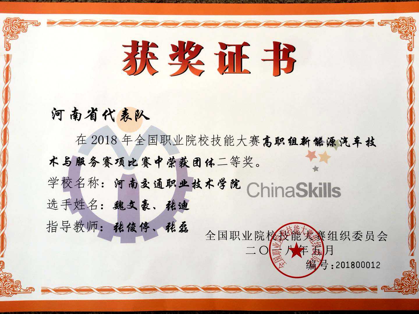 5月11-12日,2018年全国职业院校技能大赛高职组“新能源汽车技术与服务”赛项在天津职业大学举行,由我院袁荷伟副院长带队,指导教师张俊停、张磊、董隆老师与宝马汽车16301班魏文豪、张迪两位同学组成的学院代表队,代表河南参加比赛。魏文豪、张迪两位同学在比赛中沉着应战、发挥良好,总分排名全国第七,获得团体二等奖。