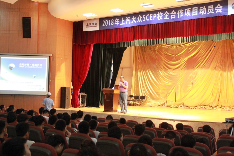 6月13日下午,上汽大众SCEP项目动员会在艺术中心一楼报告厅举行。汽车学院院长朱学军、SCEP项目组老师、2017级汽运和汽电专业学生参加了本次动员会,会议由项目组徐增勇老师主持。