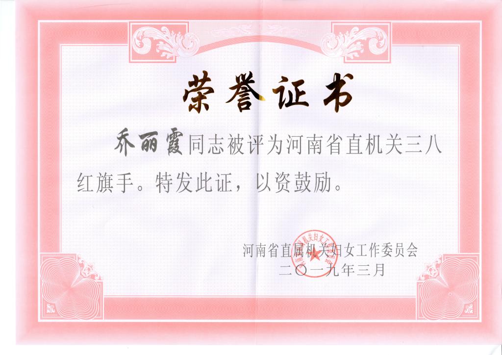 3月7日上午,河南省直机关在河南饭店举行纪念“三八”妇女节暨表彰大会,会议表彰了10名“三八红旗手标兵”、85名“三八红旗手”和20个“三八红旗集体”,汽车学院乔丽霞教师荣获“三八红旗手”称号。