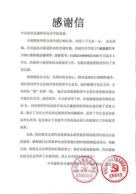 近日,我校党委收到来自中共泌阳县古城街道办事处东关委员会、党支部的一封感谢信。感谢信里面的主人翁是我校汽车学院2017级能源汽车17301班学生刘京朝。这封信中记录了刘京朝同学积极响应政府号召,在家乡和社区工作人员一道共抗疫情的点滴行动,向学校表达了立德树人,教书育人的感激之情。