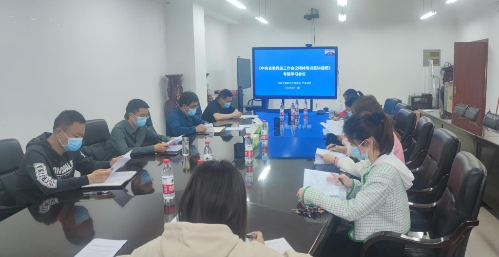 会议组织全体与会人员认真学习了《中央、省委民族工作会议精神宣讲提纲》,传达了《中共河南省委高校工委办公室、河南省教育厅办公室关于开展铸牢中华民族共同体意识主题教育工作的通知》《中共河南交通职业技术学院委员会关于印发<河南交通职业技术学院开展铸牢中华民族共同体意识主题教育活动实施方案>的通知》等文件精神,对汽车学院开展铸牢中华民族共同体意识主题教育活动进行了安排部署。