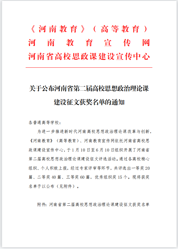 为进一步推进新时代河南高校思想政治理论课改革与创新,《河南教育》(高等教育)、河南教育宣传网依托河南省高校思政课建设宣传中心,于2022年1月10日至6月10日组织开展河南省第二届高校思想政治理论课建设征文评选活动。思政课是高校坚持社会主义办学方向的重要阵地,加强课程理论建设意义重大,我校高度重视,积极组织各课程团队加强工作研讨,撰写研究论文,这既有助于丰富思想政治教育研究成果,反哺思想政治理论课课堂教学,又进一步推动我校思想政治工作队伍建设迈上新台阶。