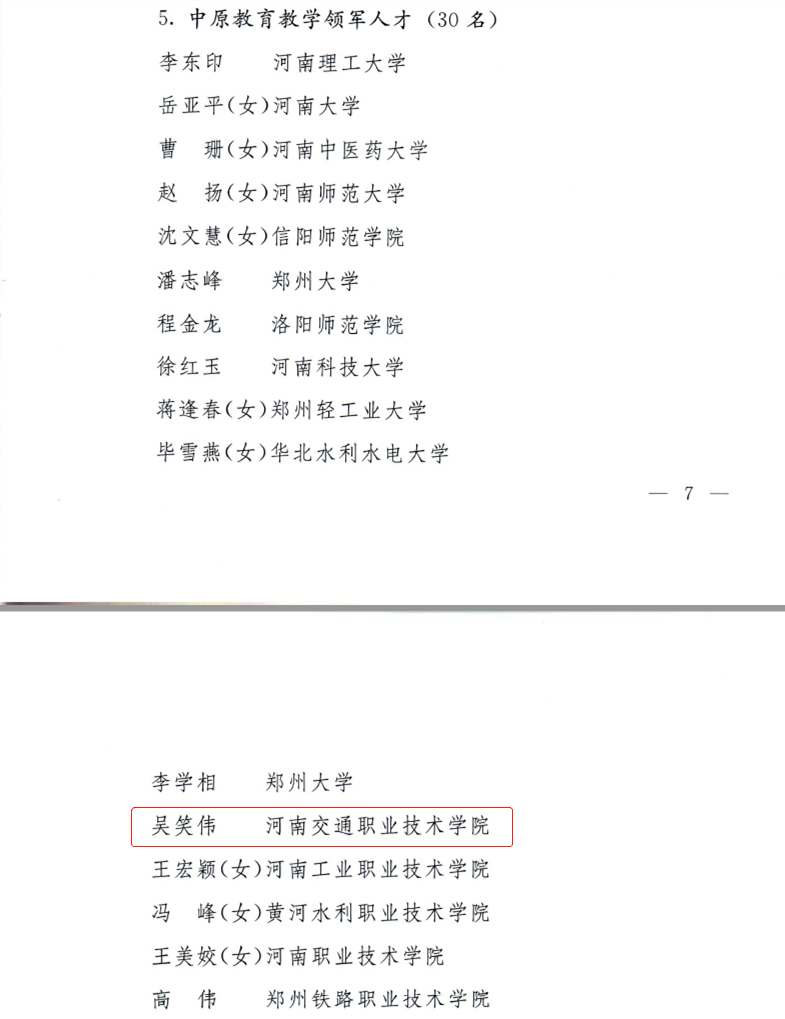 近日,中共河南省委组织部、河南省人力资源和社会保障厅印发《关于印发2022年度“中原英才计划(育才系列)”入选人员名单的通知》(豫组通〔2023〕11号),汽车学院副院长吴笑伟教授入选中原教育教学领军人才(中原教学名师)。