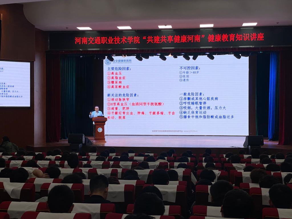为提高我校师生员工健康知识水平和面对突发事件的应急处理能力,形成人人重视健康、预防疾病的意识,11月15日下午,由汽车学院组织的“共建共享 健康河南”健康教育知识讲座在航海路校区艺术中心报告厅举行,本次讲座特邀河南省全民健康促进会宣教科刘源主任授课,共有300余名师生聆听本次讲座。
