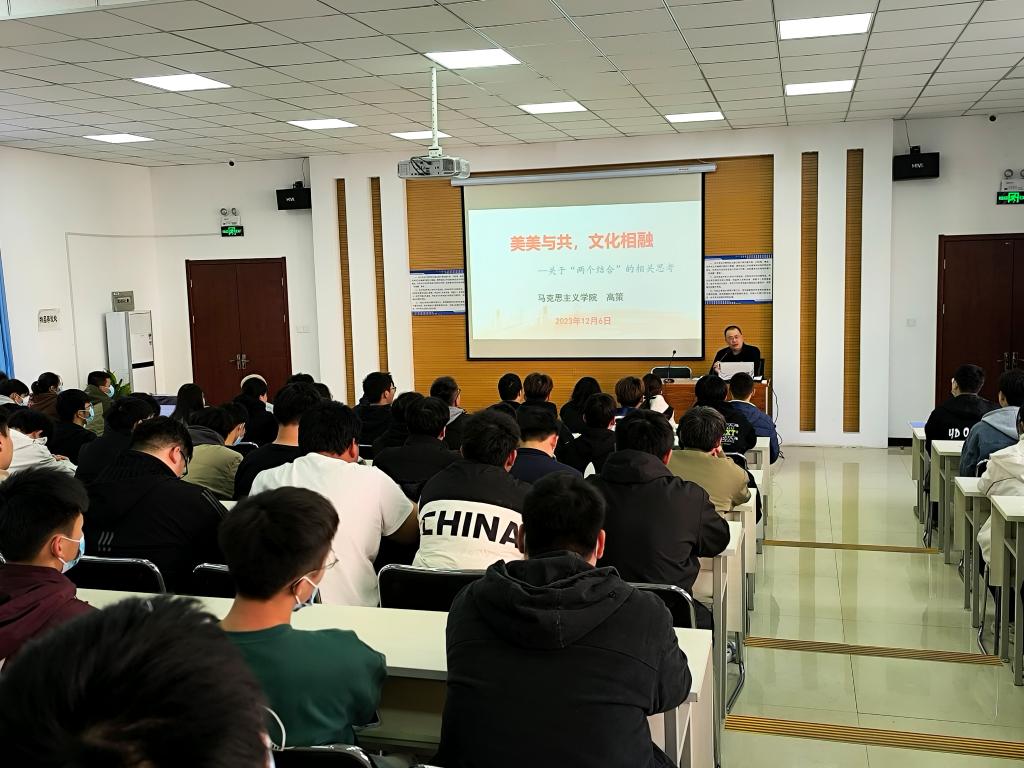 高策老师以“美美与共,文化相融—关于‘两个结合’的相关思考”为题,分别从“两个结合”的重大意义、“两个结合”的经典案例——“人类命运共同体”、理解“人类命运共同体”的三重逻辑等方面,对“第二个结合”的内涵、价值和意义进行深入解读,让广大团员青年在更广阔的文化空间中,充分运用中华优秀传统文化的宝贵资源,感悟面向未来的理论和制度创新,继承和弘扬中华优秀传统文化,用实际行动践行“两个结合”,为实现中华民族伟大复兴的中国梦贡献力量。