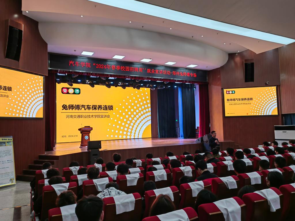 3月14日下午,汽车学院邀请郑州兔师傅汽车维修有限公司(以下简称兔师傅)到校举办“2024年春季校园招聘周”优质企业宣讲活动。兔师傅人力资源总监陈家鹏等一行3人、汽车学院副院长杨长征出席活动,300余名学生参与此次活动。