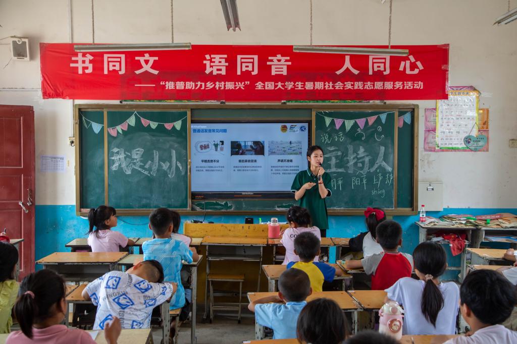 乡村振兴,教育先行。教育在乡村振兴中发挥着基础性、先导性作用。为深入贯彻落实习近平总书记关于教育的重要论述和关于语言文化的重要指示批示精神,立足服务铸牢中华民族共同体意识,7月中旬,河南交通职业技术学院汽车学院“交息相连,声生不息”实践团,前往河南省息县东岳镇秦围孜小学开展为期两周的“推普助力乡村振兴”暑期支教社会实践活动。通过选拔具有一定语言文字基础、专业特长的在校大学生深入乡村小学,围绕“说好普通话、写好规范字”,针对不同年龄阶段的学生构建多维推普课程。精心设计教学方案,开设“童语同心学音调”朗诵课和“我是小小播音员”模仿课,实践团成员通过组织孩子们分别使用普通话和当地方言两种形式,诵读《沁园春·长沙》《七律·长征》等经典名篇诗歌,模仿电视节目主持人播报发生在自己身边的最有趣的一件事,巧妙的将当地方言和普通话的差异进行对比,从普通话发音、表达应用等方面入手,现场指导培训,帮助孩子们纠正发音问题,掌握正确的发音方法,提高普通话表达能力,更让孩子们知道了讲好普通话在有效促进人与人之间交流的重要性,让孩子们在抑扬顿挫中感受语言表达的魅力,提升孩子们国家通用语言文字的应用能力。