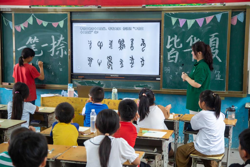 推普实践团精心设计教学方案,科学组织教学活动,在秦围孜小学面向80余名留守儿童,开展了为期10天丰富多样、特色浓厚的支教课程。开设“童语同心学音调”朗诵课和“我是小小播音员”模仿课,通过组织孩子们分别使用普通话和当地方言两种形式,巧妙地将当地方言和普通话的差异进行对比,帮助孩子们纠正发音问题,掌握正确的发音方法,提高普通话表达能力;开设“最是书香能致远”冰心儿童文学作品鉴赏、书信课,以书信为载体锻炼提升学生书面表达能力与情感传达能力;开设“我是小小书法家”书法教学课,通过示范讲解书法书写要领,从基础理论、基本技法、作品赏析等方面,手把手带着孩子们教孩子们学会正确运笔、控笔,书写“横竖点撇捺”等基本汉字笔画,并组织开展规范汉字书写比赛,评选优秀作品,激发学生书写热情,感受汉字魅力,写好规范字。