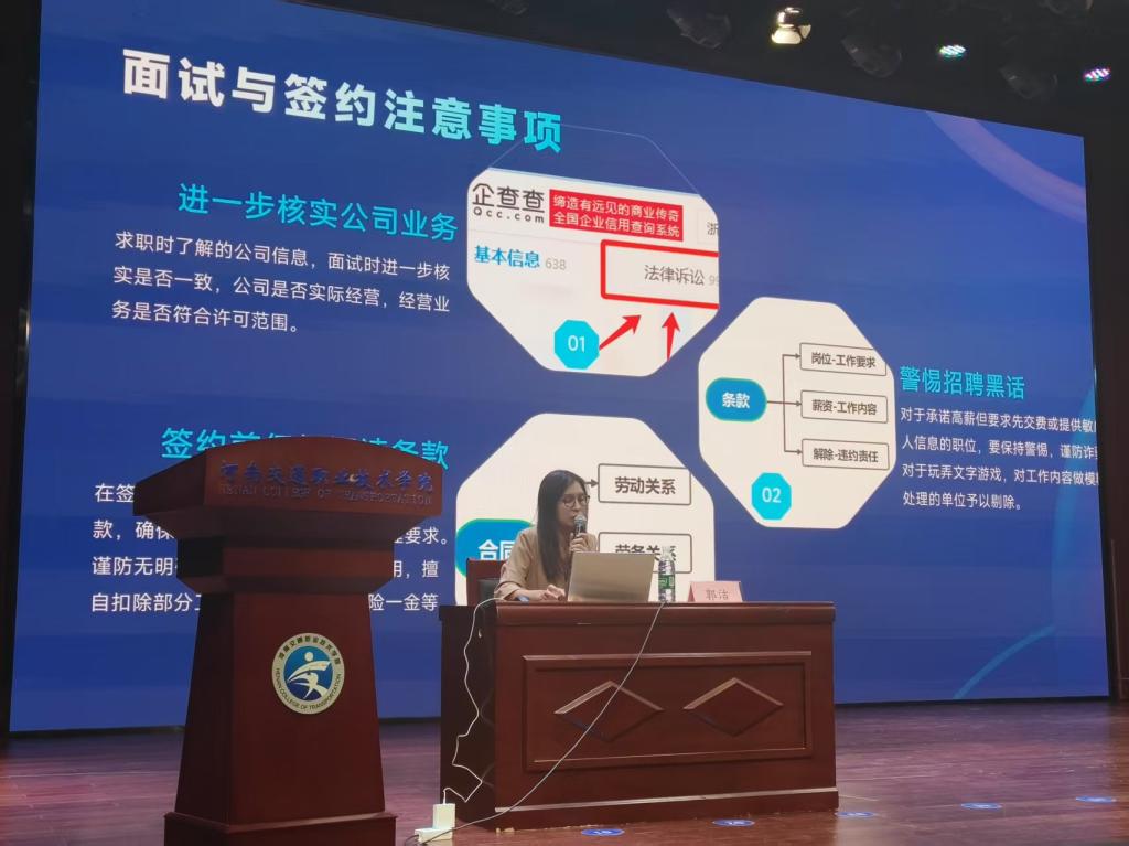 为扎实推进就业护航行动,5月14日,汽车学院联合郑州市消费者协会,邀请知名公益律师团队举办“求职路上巧避坑 权益守护我先行”专题法律讲座,为即将步入实习岗位的学子送上实用“法律锦囊”。郑州市消费者权益保中心副主任程妍妍出席活动,2023级300余名学生参加活动。