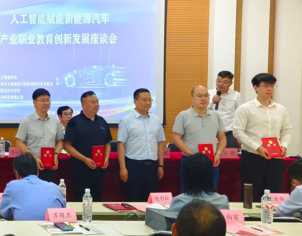 会议设置主题报告、经验分享及实训基地参观环节。吴廷伟、马广建、田俊廷、李小强共同为专委会首批专家颁发聘书。新乡职业技术学院交通学院院长原伟、郑州商业技师学院汽车系主任袁书新、河南省理工中等专业学校汽车系副主任付亦凡等院校代表,分别围绕新能源汽车专业群建设、智能网联汽车技术人才培养等议题分享实践经验。企业代表蔚来汽车研发试验中心项目经理李政毅、宇通集团校企合作部部长张晓峰、学而为智能汽车公司总经理陈胜及中汽智联技术有限公司职教项目经理史泽翔则从产教融合、校企合作等角度,展示了人工智能技术赋能职业教育的创新方案与路径。专委会执行主任容亚东对工作计划进行系统阐述,明确下一步行动方向。