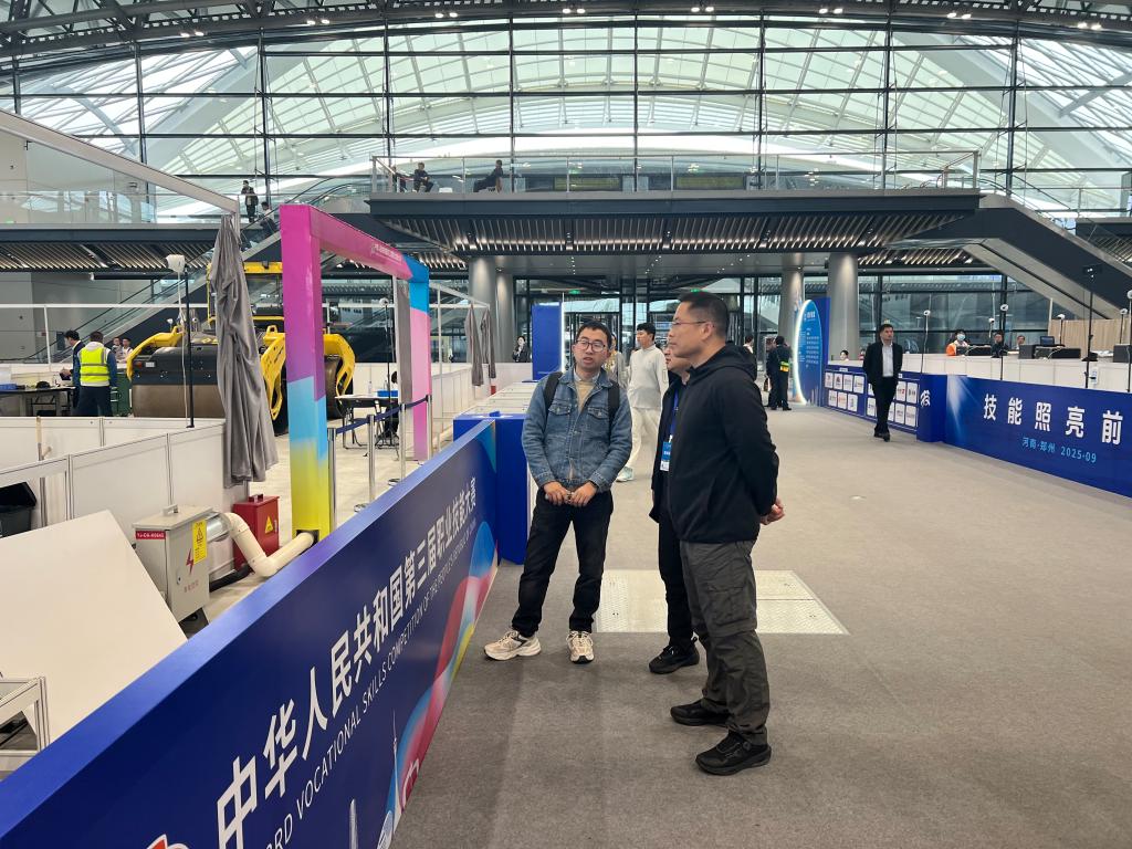 在比赛现场,李小强一行深入赛项场地,仔细观摩刘毅的操作流程,详细询问比赛环节设置、核心技术难点及选手适应情况,叮嘱选手沉着应战、发挥水平,同时关心工作人员的后勤保障需求。随后,在国家成果展馆,李小强与交通运输部职业资格中心职业技能竞赛处处长张巍展开深入交流。张巍对我校在交通运输行业选拔赛中的优异成绩给予高度肯定,特别感谢我校对第三届全国职业技能大赛的全力支持。期间,李小强一行还与天津交通、宁波技师等院校的领队及大赛专家深入交流探讨,围绕技能人才培养模式、赛教融合路径等话题分享实践经验。
