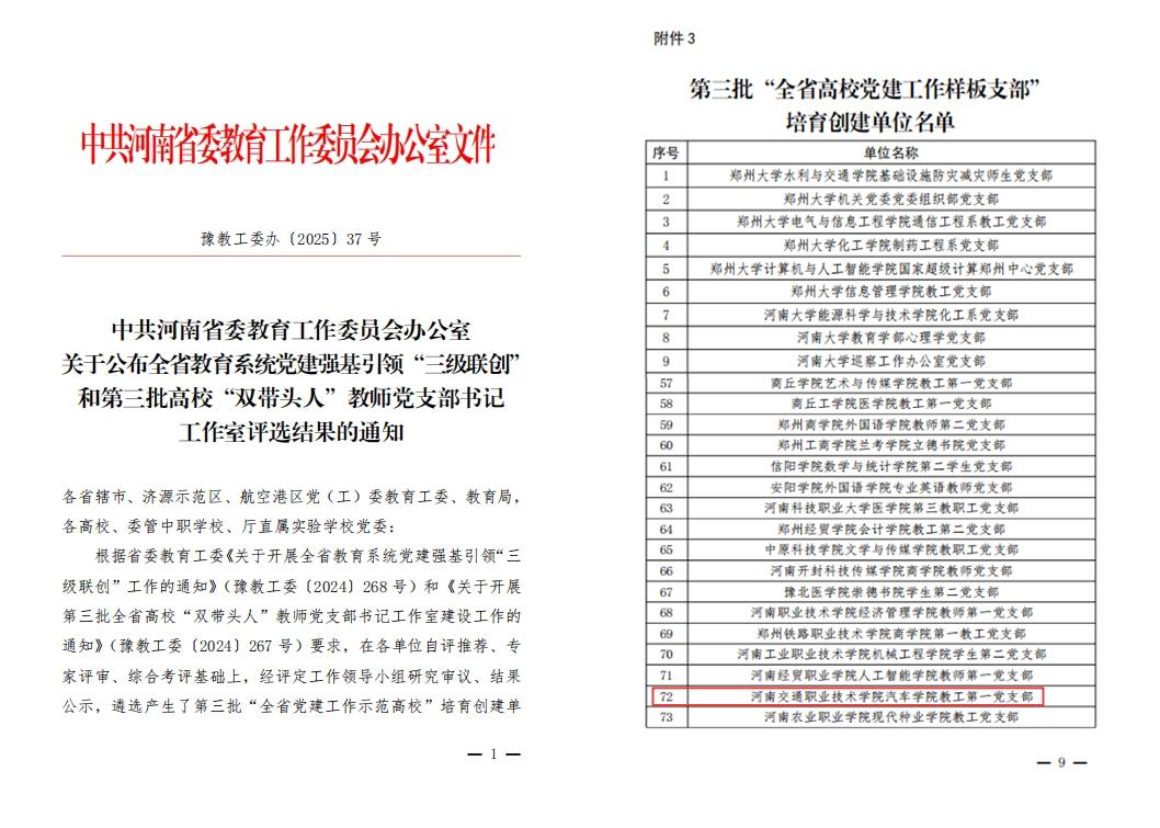 近日,中共河南省委教育工作委员会印发《关于公布全省教育系统党建强基引领“三级联创”和第三批高校“双带头人”教师党支部书记工作室评选结果的通知》(豫教工委办〔2025〕37号),学校汽车学院教工第一党支部入选第三批“全省高校党建工作样板支部”培育创建单位。