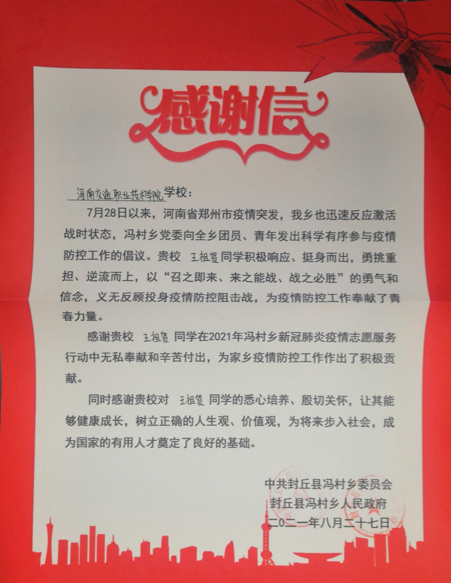 近日,学校党委收到来自中共封丘县冯村乡委员会、封丘县冯村乡人民政府的一封感谢信。感谢信里面的主人翁是我校汽车学院2015级汽车装配15301班学生王祖贺。这封信中记录了王祖贺同学积极响应政府号召,在家乡和工作作人员一道共抗疫情的点滴行动,向学校表达了立德树人,教书育人的感激之情。