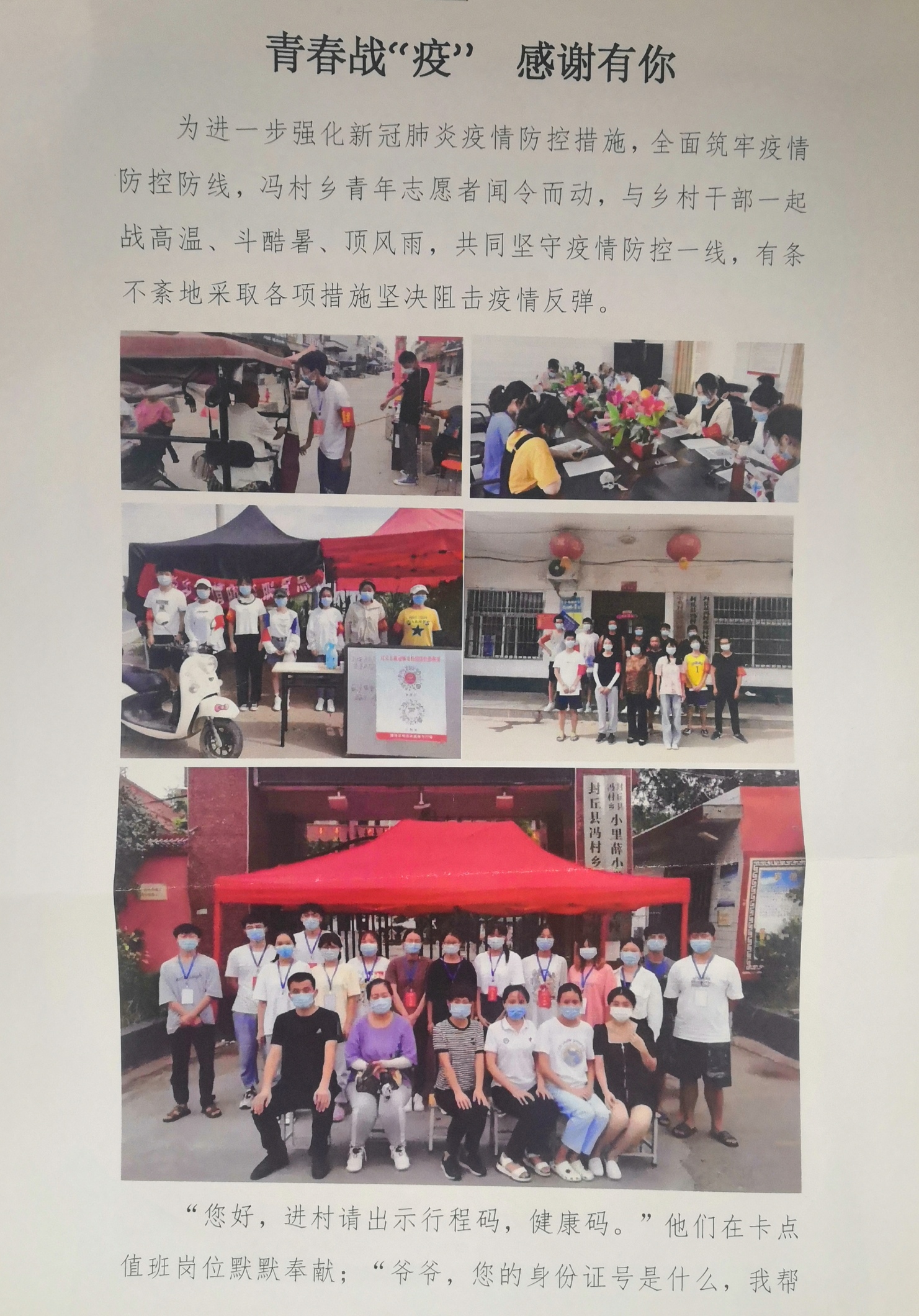 7月28日以来,冯村乡党委向全乡团青、青年发出科学有序参与疫情防疫工作的倡议。王祖贺同学积极响应、挺身而出,勇挑重担、逆流而上,以“招之即来、来之能战、战之必胜“的勇气和信念,义无反顾投身疫情阻击战,为疫情防控工作奉献了青春力量。感谢我校王祖贺同学在2021年冯村乡新冠肺炎疫情志愿服务行动中无私奉献和辛苦付出,为家乡疫情防控工作作出了积极贡献。感谢我校对王祖贺同学细心培养、殷切关怀,让其能够健康成长,树立正确的人生观、价值观,为成为国家的有用人才奠定了良好的基础。