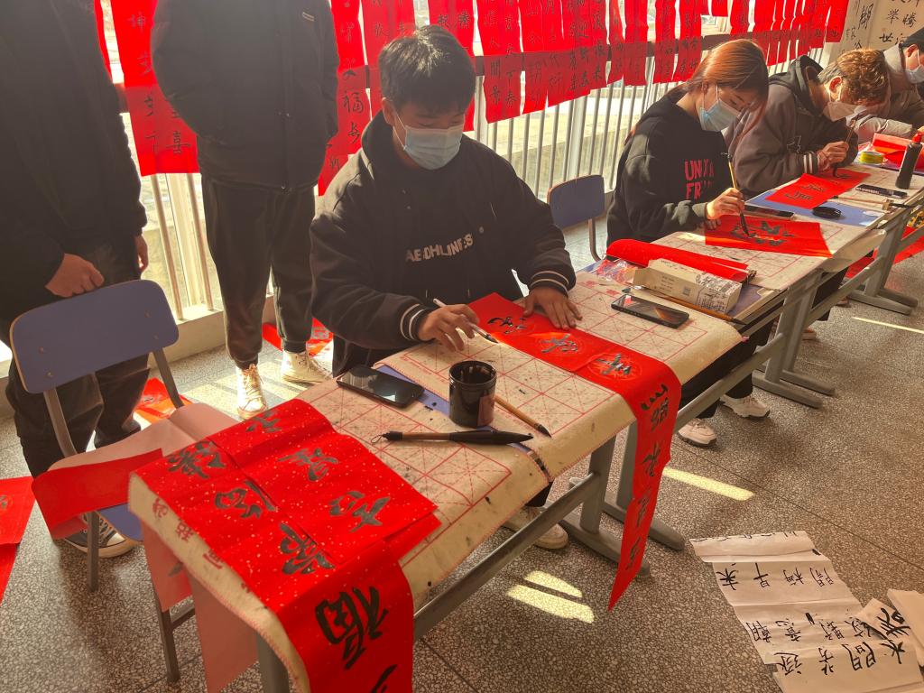 书写现场喜庆祥和、气氛热烈,墨润红纸、笔走龙蛇,或风雅有致,或遒劲聚力,一幅幅散发清新墨香的美好祝福跃然纸上。既有挥别旧岁、喜迎新春的美好愿景,也有歌颂党恩、热爱家园、宏图大展的励志高歌。师生们纷纷驻足欣赏,赞不绝口。一副副红彤彤的对联,表达了师生们对美好生活的殷殷期盼,展示着中华文化的源远流长与博大精深。