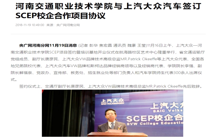 央广网河南分网:学院与上汽大众签订SCEP合作协议