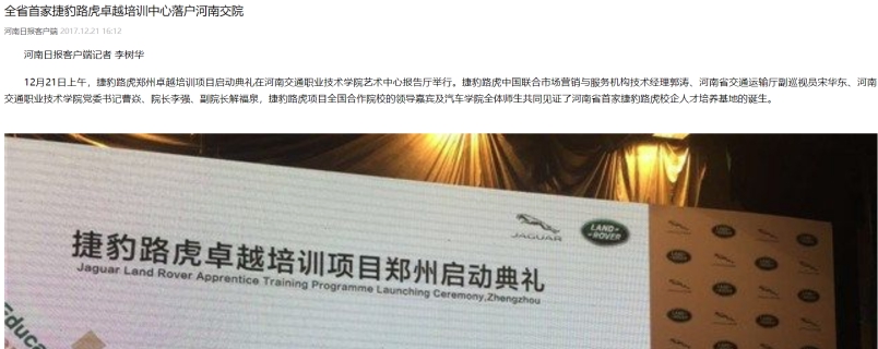 河南日报:全省首家捷豹路虎卓越培训中心落户河南交院