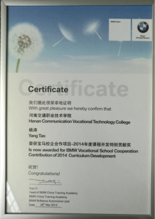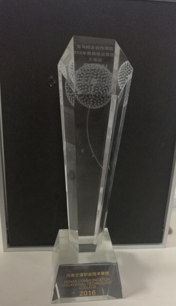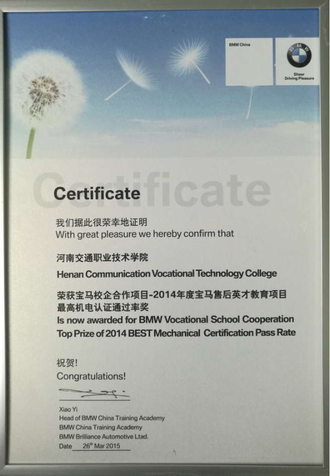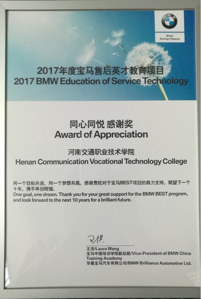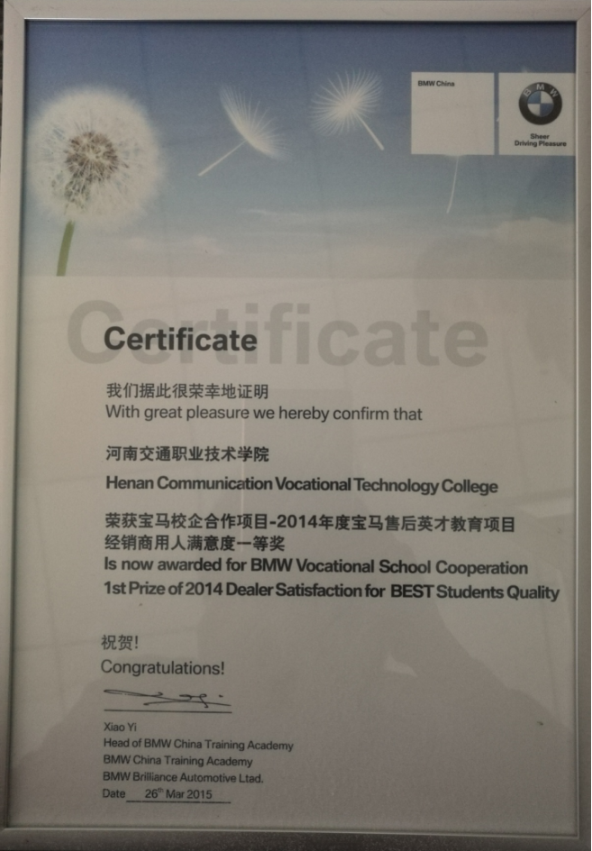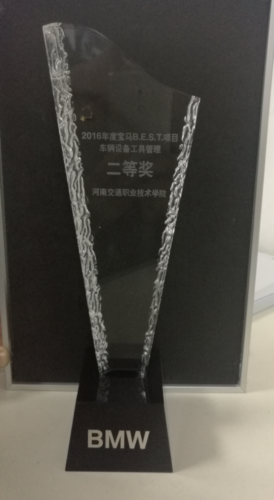 宝马集团BEST郑州培训基地简介由河南交通职业技术学院与华晨宝马集团共同投资建设,使用面积1300余平方米,分为3个技术培训单元、1个非技术培训单元及配套的工具室、办公室及茶歇区等。基地共投资近1000万元,双方投入比例为1:1。宝马公司提供的主要包括诊断系统、整车、教师的培训、总成及实训耗材,河南交通职业技术学院配套的主要包括宝马二手车辆及通用专用工具等。基地于2013年8月经过宝马公司验收并开始试运行,2014年5月23日正式运行。基地主要承担BEST学生培训和宝马经销商员工培训,培训领域有机电、服务、零件等 3类, 项目范围已覆盖经销商主要售后岗位.