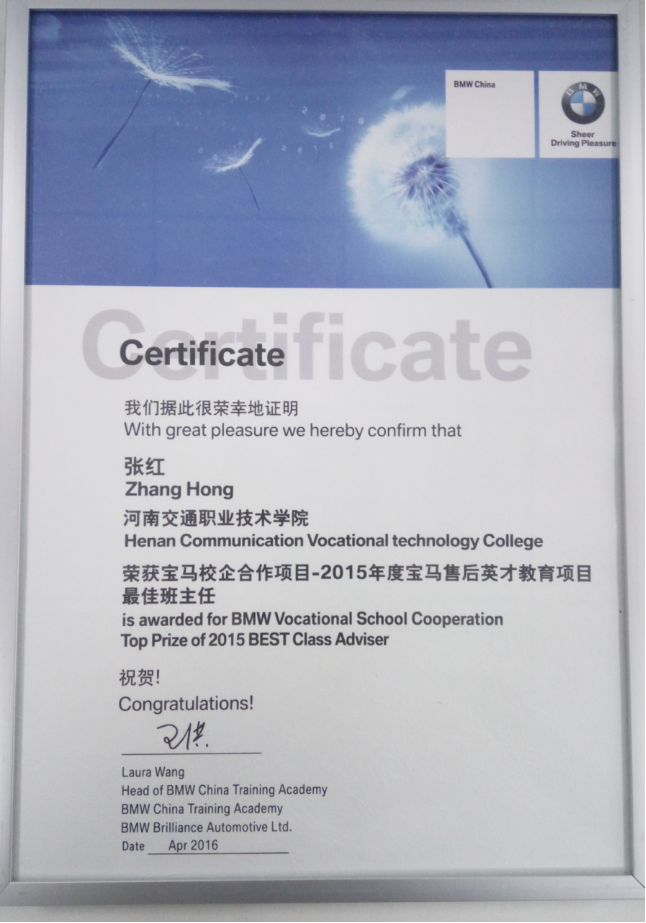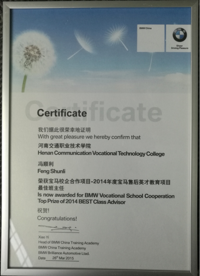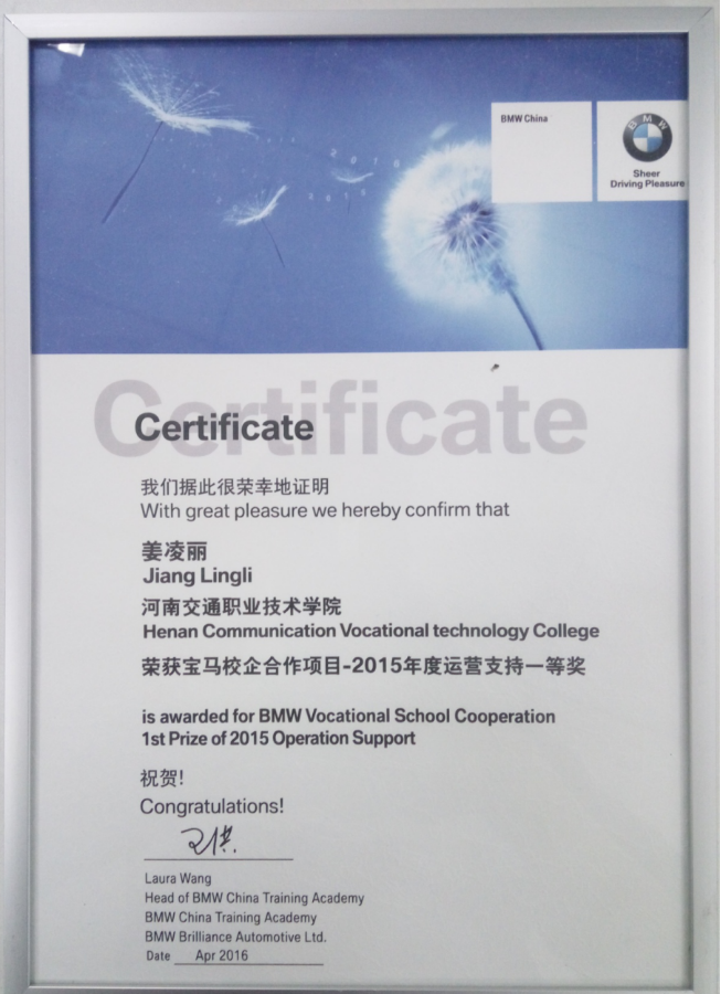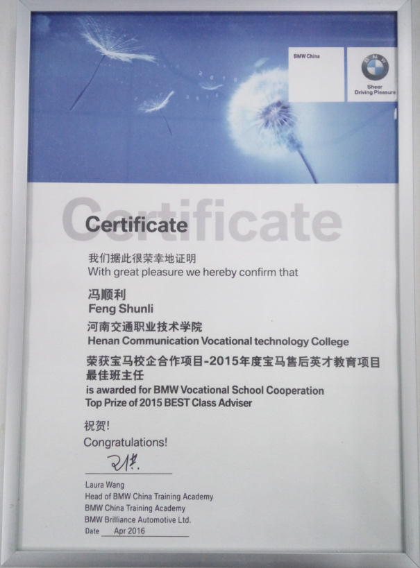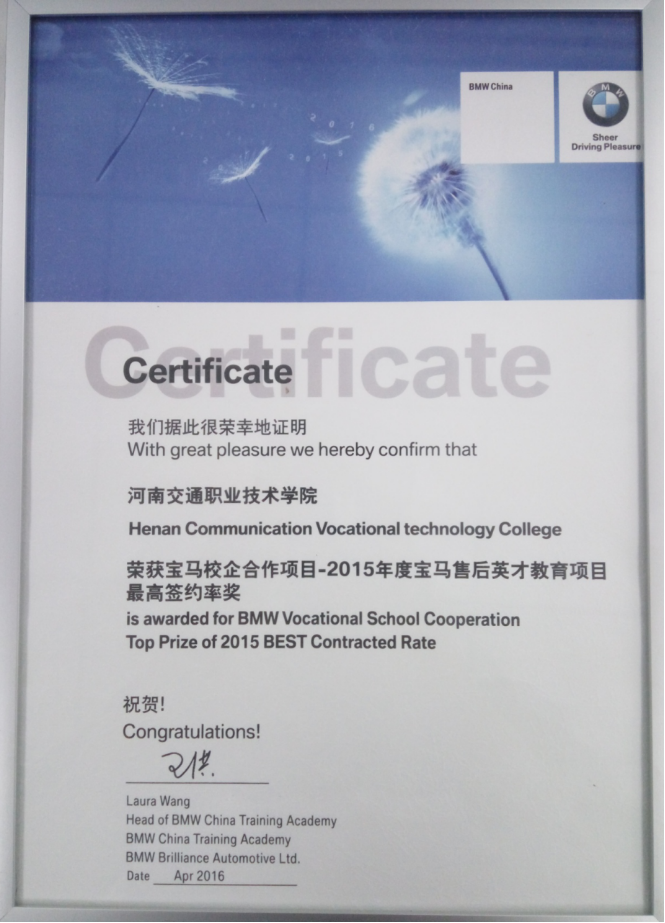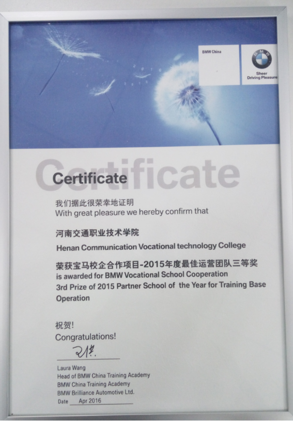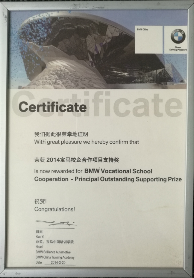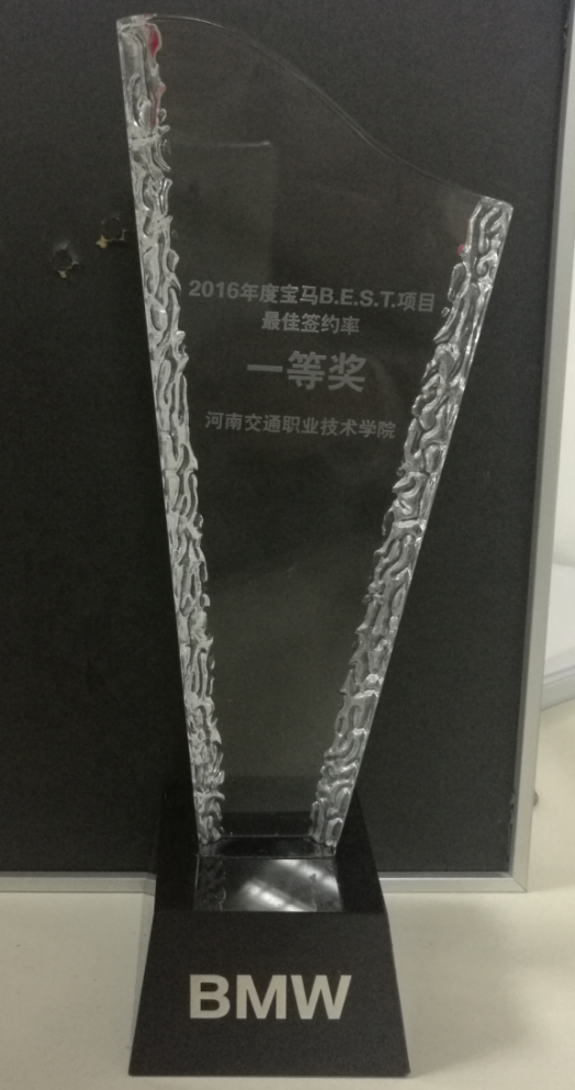 2013年5月举行了第一届宝马专场招聘会,招聘会后成立了第一届宝马BEST班,共22人。到目前为止已经成功举办五期宝马专场招聘会,促进学生就业达到400人左右,成功组建五届宝马订单班,订单班培养人数200人左右。