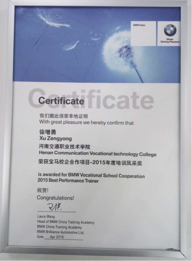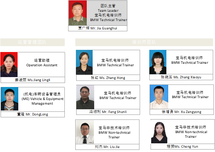 目前郑州宝马培训基地拥有8名通过了宝马认证的培训师,其中6名机电培训师,2名非技术培训师,都具备对BEST学生进行培训的资格,其中有6名培训师已经获得了员工培训的资格。另外,培训基地还配备了1名基地运营助理和1名设备管理员。