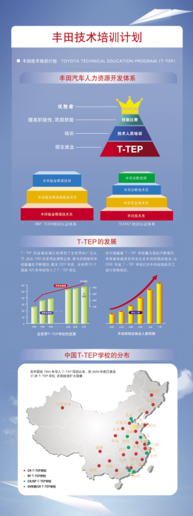 ★ T-TEP在中国:丰田1994年将T-TEP项目引入中国;2004年教育部与丰田(中国)和一汽丰田共同签署建设T-TEP学校合作项目的协议,开创了一种新的校企合作模式——T-TEP学校。