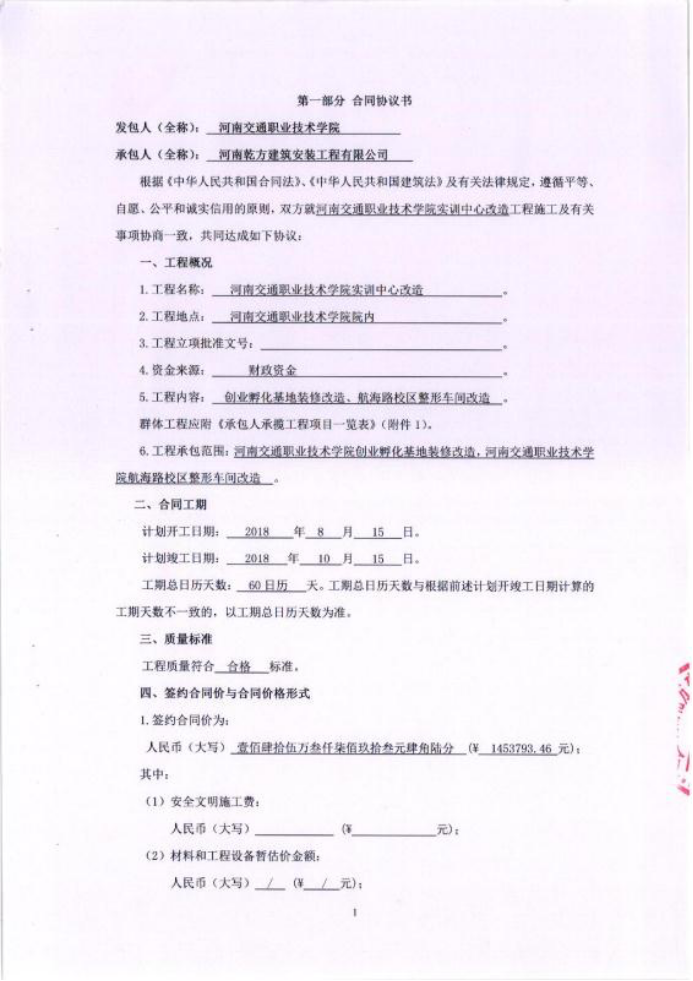 附件一:孵化中心施工合同