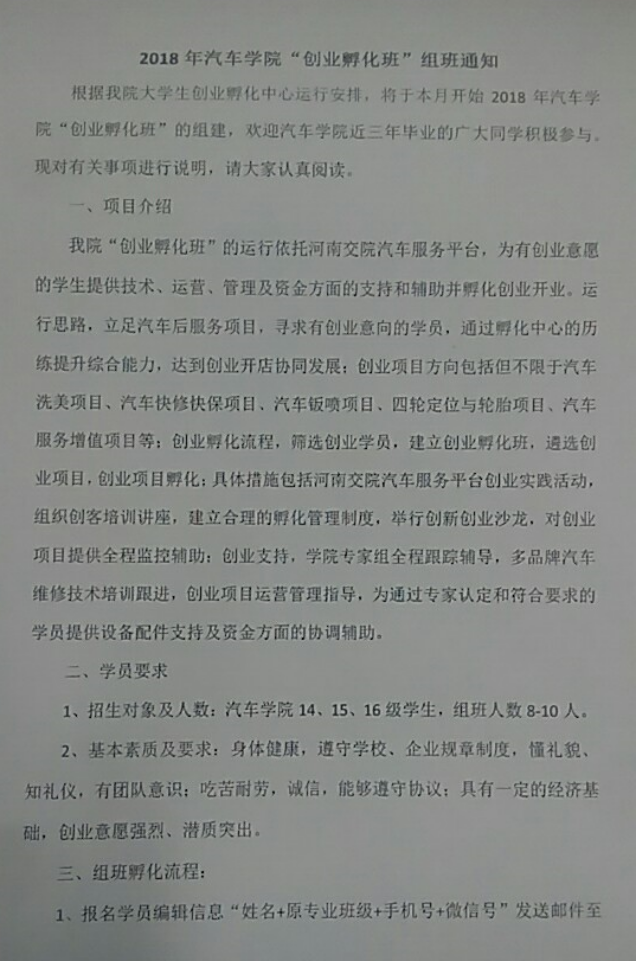 利用汽车学院就业协会的优势,在学生中进行动员,把有意愿创业并具备一定条件创业的学生推荐孵化中心推荐给专门负责老师,并为学生建立个人档案。